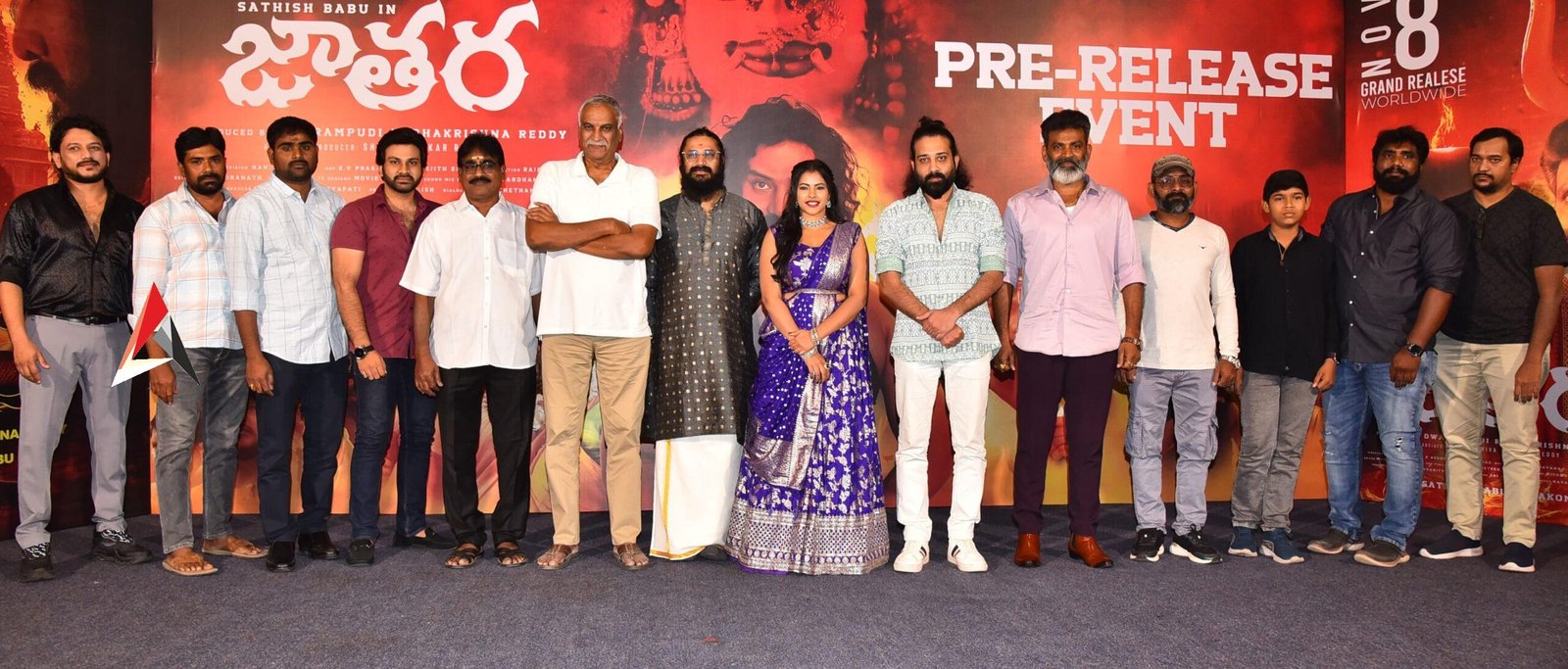 సతీష్ బాబు రాటకొండ హీరోగా నటిస్తూ, దర్శకత్వం వహించిన సినిమా ‘జాతర’. దీయా రాజ్ హీరోయిన్ గా నటించారు. ఈ చిత్రాన్ని గల్లా మంజునాథ్ సమర్పణలో మూవీటెక్ ఎల్ఎల్సితో కలిసి రాధాకృష్ణ ప్రొడక్షన్ కంపెనీ పతాకంపై రాధాకృష్ణారెడ్డి, శివశంకర్ రెడ్డి నిర్మించారు. ఇంత వరకు ఎవ్వరూ టచ్ చేయని పాయింట్తో రగ్డ్గా, ఇంటెన్స్ డ్రామాతో ‘జాతర’ తెరకెక్కింది. చిత్తూరు జిల్లా బ్యాక్ డ్రాప్లో జరిగే జాతర నేపథ్యంలో రూపొందిన ఈ సినిమా ఈ నెల 8న థియేటర్లోకి రాబోతోంది. ఈ క్రమంలో జాతర ప్రీ రిలీజ్ ఈవెంట్ను సోమవారం నాడు నిర్వహించారు.