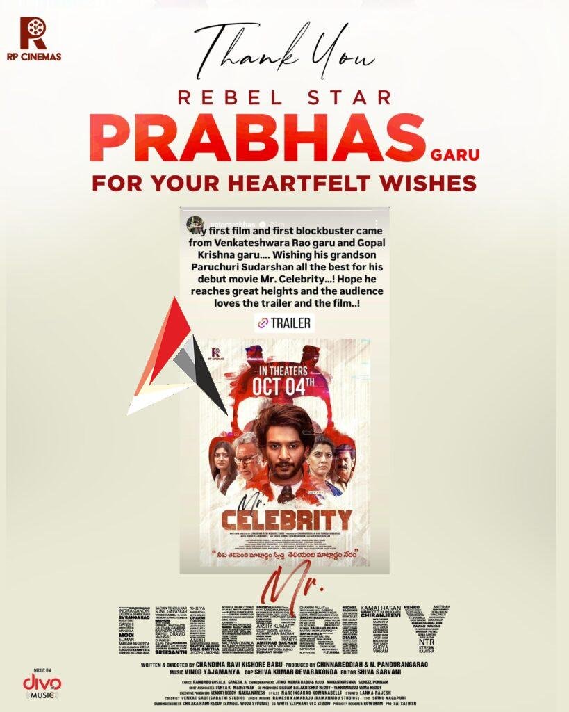 మిస్టర్ సెలెబ్రిటీ మూవీకి ప్రభాస్ తన వంతుగా సాయం చేశారు. సోషల్ మీడియా వేదికగా మిస్టర్ సెలెబ్రిటీ మూవీ గురించి పోస్ట్ వేశారు. ‘నాకు మొదటి బ్లాక్ బస్టర్ పరుచూరి వెంకటేశ్వరరావు ఇచ్చారు.. ఆయన మనవడు సుదర్శన్ హీరోగా వస్తున్న మిస్టర్ సెలెబ్రిటీ పెద్ద విజయాన్ని సాధించాలి.. సుదర్శన్ మున్ముందు విజయాలు సాధిస్తూ మరింత ఎత్తుకు ఎదగాలి’ అని అన్నారు.