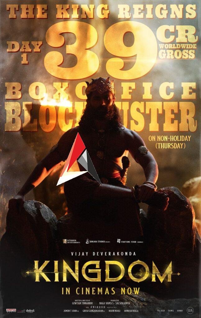 విజయ్ దేవరకొండ హీరోగా నటించిన రీసెంట్ బ్లాక్ బస్టర్ “కింగ్డమ్” బాక్సాఫీస్ వద్ద సెన్సేషన్ క్రియేట్ చేస్తోంది.ఈ సినిమా డే 1 వరల్డ్ వైడ్ 39 కోట్ల రూపాయల గ్రాస్ రాబట్టి ట్రేడ్ వర్గాలను ఆశ్చర్యపరిచింది. గురువారం ప్రేక్షకుల ముందుకొచ్చిన ఈ సినిమా ఒక వీక్ డే లో ఇంత భారీ వసూళ్లు సాధించడం “కింగ్డమ్” సక్సెస్ రేంజ్ ను ప్రూవ్ చేస్తోంది. సూపర్ హిట్ టాక్ తో ఈ సినిమాకు పెద్ద సంఖ్యలో టికెట్ బుకింగ్స్ జరుగుతున్నాయి.